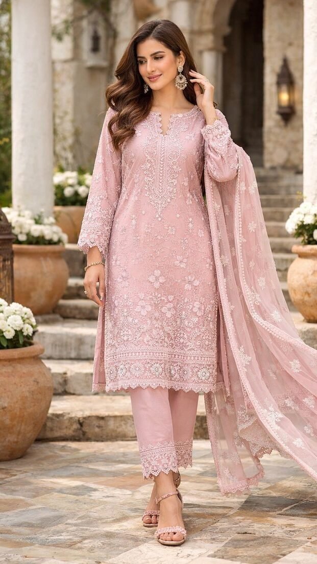 This pastel pink ready-to-wear Pakistani dress features intricate floral embroidery and a flowing dupatta, perfect for weddings, festive occasions, or casual parties. Made from soft, breathable fabric, it combines elegance with comfort. Ideal for women who love traditional yet modern outfits.